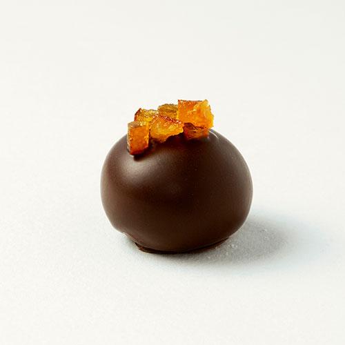 Massapà amb trossets de taronja, banyat amb xocolata negra i decorat amb taronja confitada.